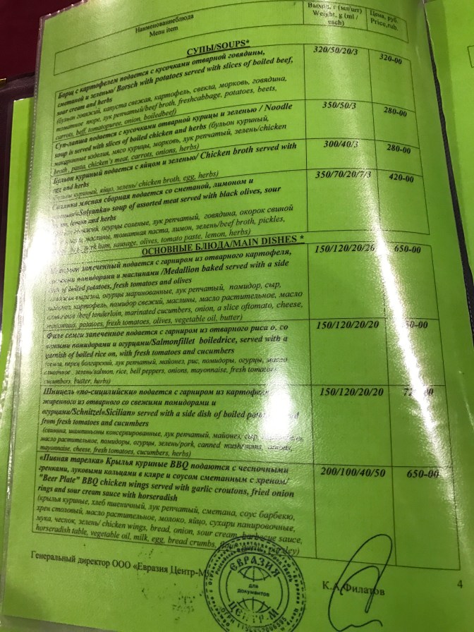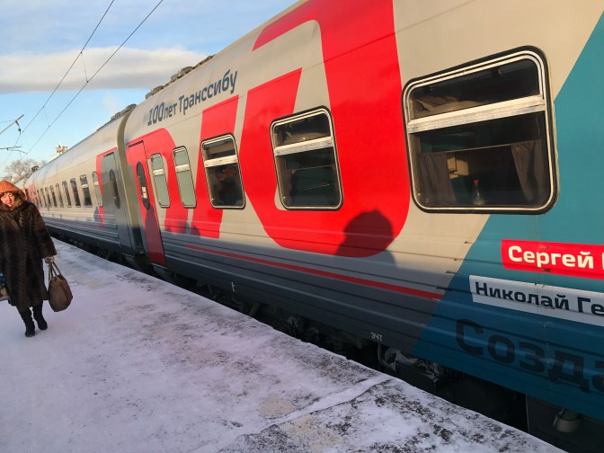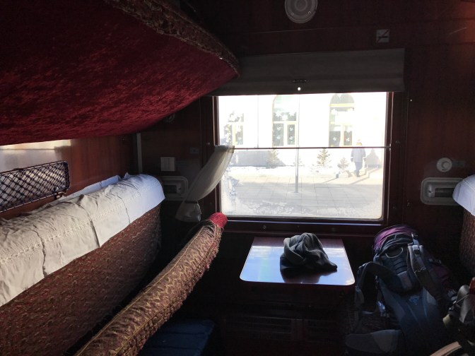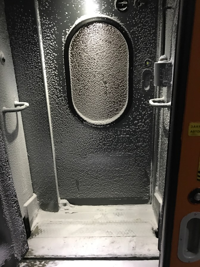 The train ride was very clean, warm and nice in general. Unlike the bustling summer rides, winter was considered to be a “low-season” and we were the only passenger in the first class and were able to have all the solitude that we wanted from the one-week train ride. I kept tracking the temperature outside on my cellphone (AT&T’s local partners did lose coverage at some point in Siberia), and with the temperature at -30-40 C outside, the internal temperature was close to probably 20C and the only place we’d see signs of the cold inside the train was in between the cars. Even though there was cold water in our compartment, we talked to a conductor (some Russian language would really pay off for the off-season) and paid the equivalence of 1-2 dollars everyday for a steamy hot shower in the crew’s section. The dining car was well run and provided decent food (my favorite was the good old borscht and tea with milk).