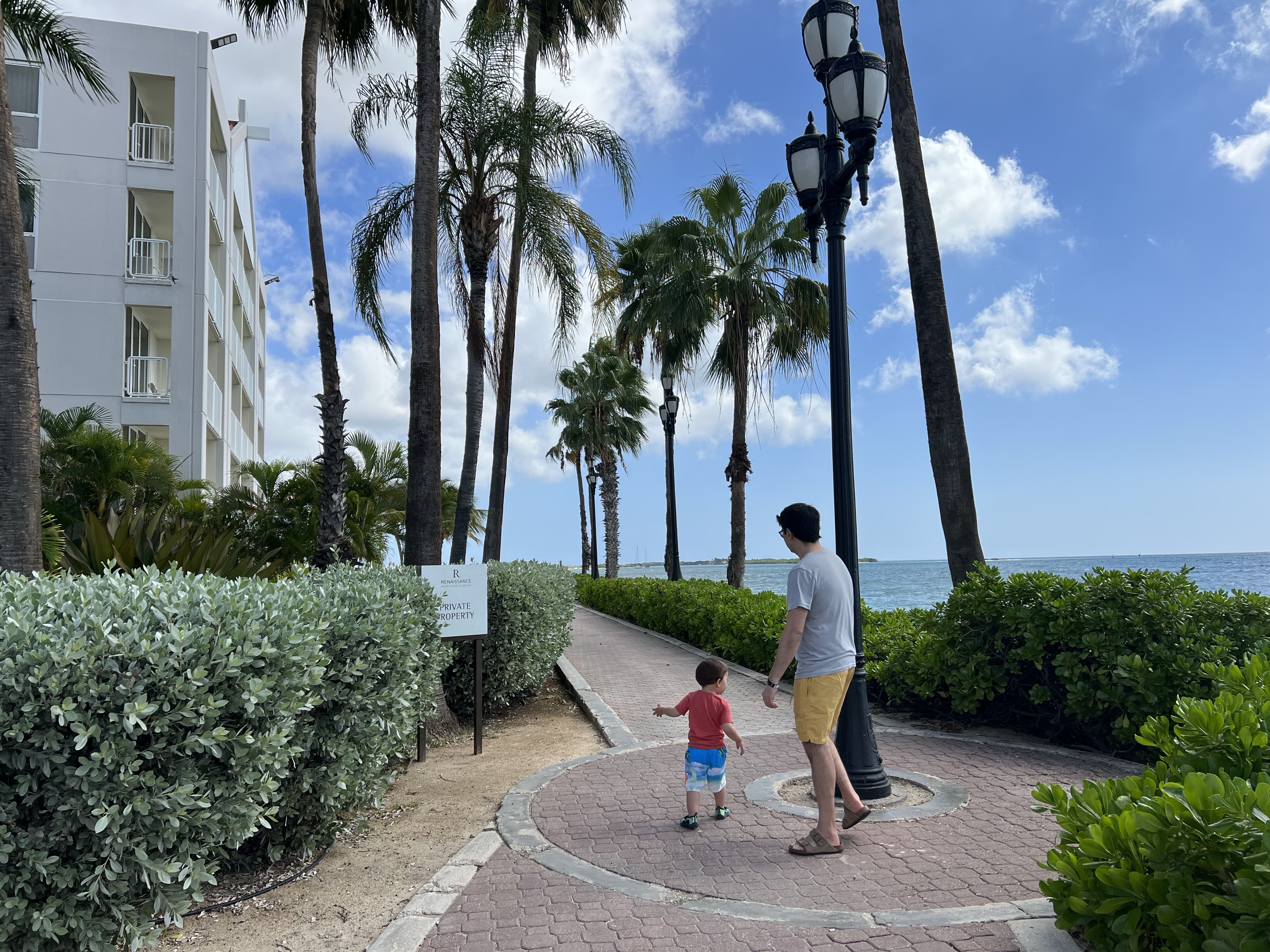 We arrived in the early afternoon and rushed to the pier to catch a water taxi to see the flamingos (free access with room keys and wristbands). In theory, the flamingos mostly hang out on the “adult-only” side of the private island (babies are not allowed there except between 9am and 10am). However, they would also take a stroll to the family side of the island in the afternoon around 2-3pm, and we were lucky to catch sight of them just as we finished our late lunch at the only restaurant on the island (in addition to quite a few iguanas). There is a vending machine where one can get food for these big birds with a quarter near the adult side, but by the time we saw the flamingo in the afternoon, they looked pretty well fed already. Nissik was super excited to follow these beautiful creatures, as they wade threw the shallow water and began to make their way back to the adult-only side of the island. It took us quite some effort to prevent him from actually touching these birds.